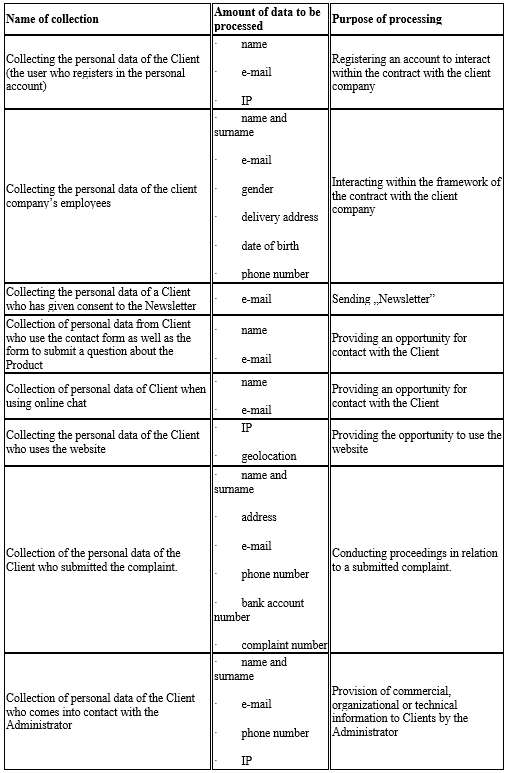 - Name of collection Amount of data to be processed Purpose of processing Collecting the personal data of the Client (the user who registers in the personal account) · name · e-mail · IP Registering an account to interact within the contract with the client company Collecting the personal data of the client company’s employees · name and surname · e-mail · gender · delivery address · date of birth · phone number Interacting within the framework of the contract with the client company Collecting the personal data of a Client who has given consent to the Newsletter · e-mail Sending „Newsletter” Collection of personal data from Client who use the contact form as well as the form to submit a question about the Product · name · e-mail Providing an opportunity for contact with the Client Collection of personal data of Client when using online chat · name · e-mail Providing an opportunity for contact with the Client Collecting the personal data of the Client who uses the website · IP · geolocation Providing the opportunity to use the website Collection of the personal data of the Client who submitted the complaint. · name and surname · address · e-mail · phone number · bank account number · complaint number Conducting proceedings in relation to a submitted complaint. Collection of personal data of the Client who comes into contact with the Administrator · name and surname · e-mail · phone number · IP Provision of commercial, organizational or technical information to Clients by the Administrator